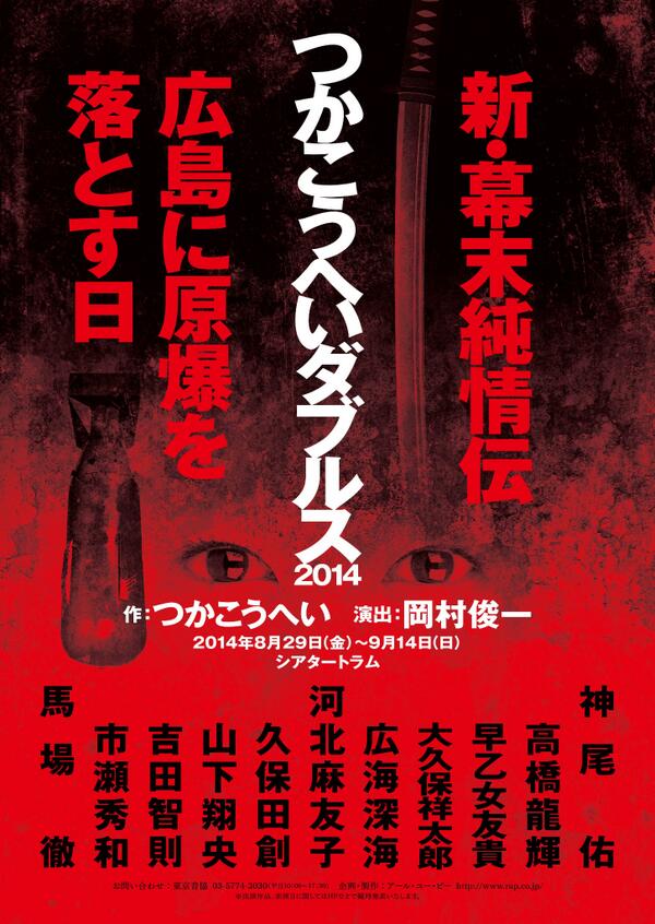 本日の「つかこうへいダブルス2014」制作発表の模様をブログに公開いたしました。「新・幕末純情伝」「広島に原爆を落とす日」2本続けてお送りします。まずはこちら「新・幕末純情伝」→ameblo.jp/rupplay/entry-…