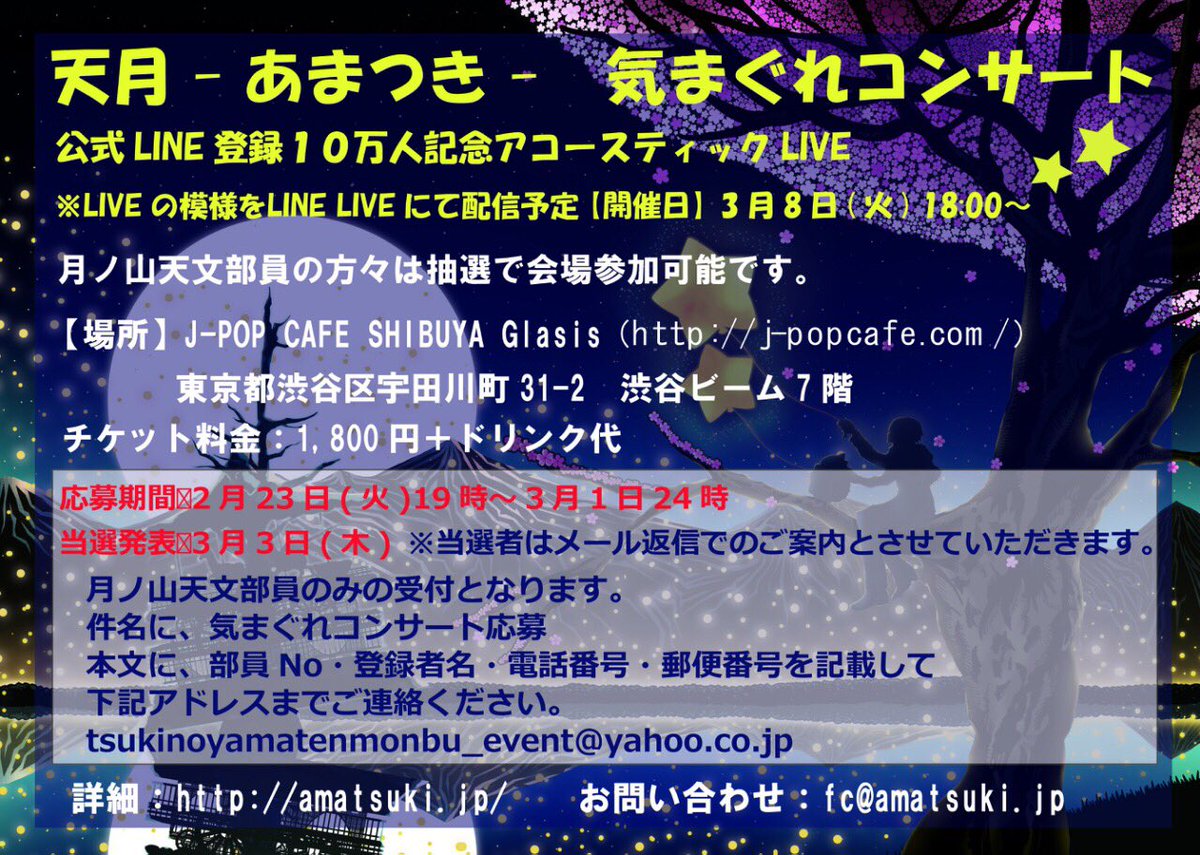 公式LINE登録10万人記念(ありがとうございます!)でアコースティックのLIVE配信を企画しています!題して!『天月-あまつき-の気まぐれコンサート』