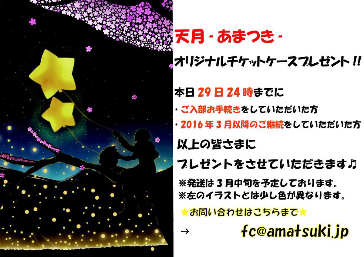 そしてそしてもう一つお知らせ!!この度部員の皆さまに日ごろの感謝の気持ちと春からの新生活が始まる方々への応援の気持ちをこめて天月-あまつき-からライブの告知POPにも使用させていただいているイラストを元にデザインをしたチケットケースをプレゼントさせていただくことになりました!!