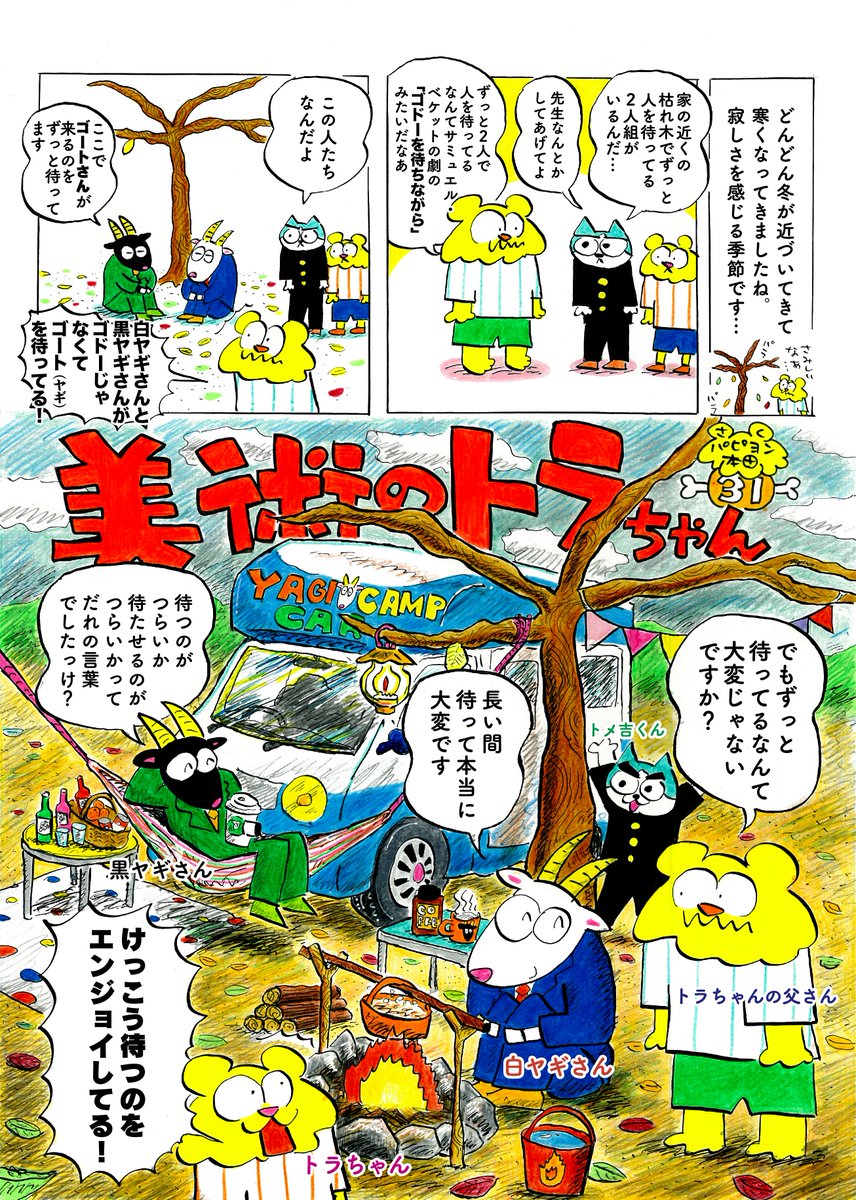 人を待つのにも寂しさを感じるこの季節。トラちゃんたちは、誰かを一心に待つヤギ二人に出会いました。待っているのはゴドーならぬ、ゴート(ヤギ)で?|@papiyonhonda
