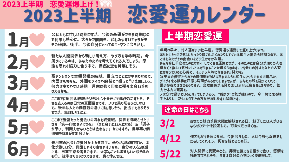 【おひつじ座編・細かすぎる星座占い】おひつじ座のみんな注目!2023上半期の運勢をめっっっっっちゃ細かくまとめました♡上半期は出会い運が好調で、人生を変える相手に会うかも!?vivi.tv/post318265/?ut…