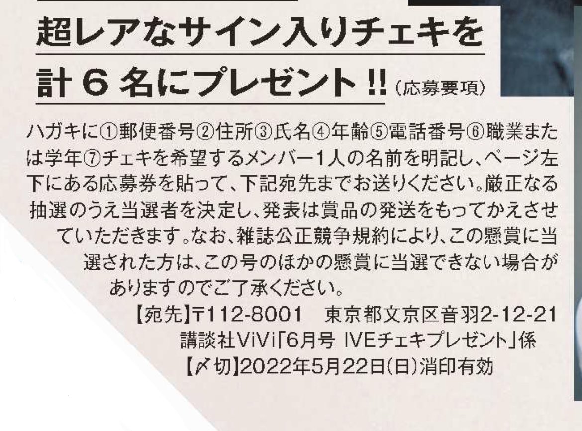 【締切間近!】ViVi6月号から応募できる #IVE のサイン入りチェキプレゼントの応募締め切りは今週末22日(日)!ページ左下の応募券をハガキに貼って応募してね。