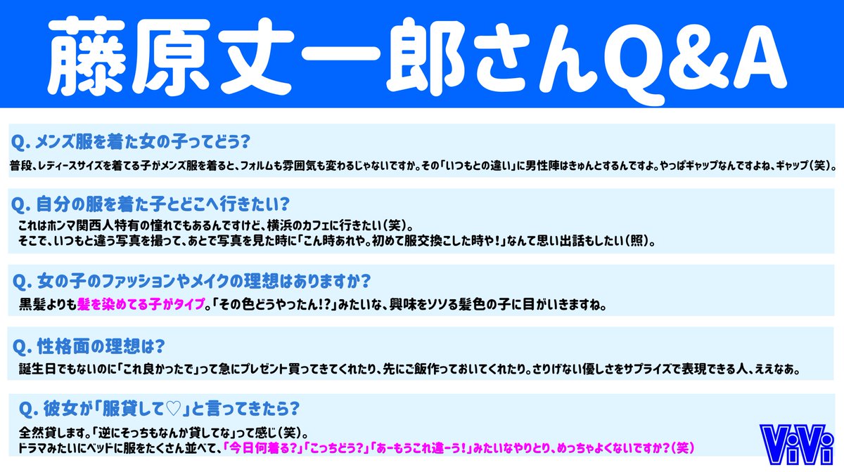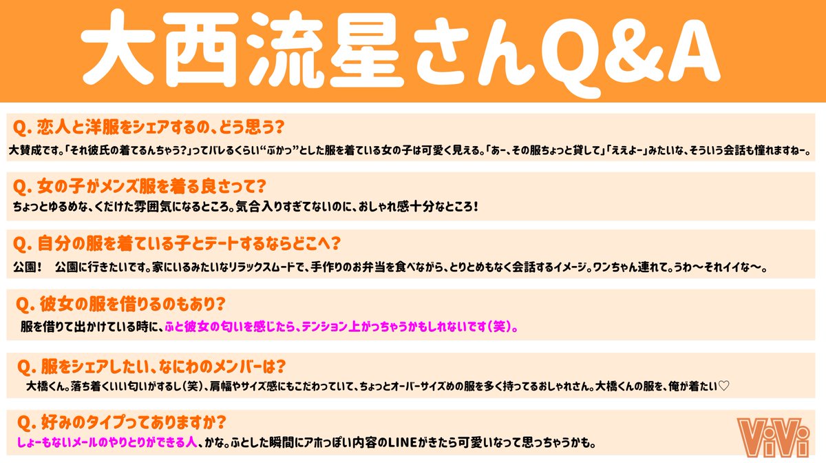 【#なにわ男子 Q&Aまとめ】今回は、自分の服を着ている子とデートするなら「横浜のカフェ」に行きたい藤原丈一郎さんと好みのタイプは「しょーもないメールのやりとりができる人」と答える大西流星さんのインタビューまとめました♡