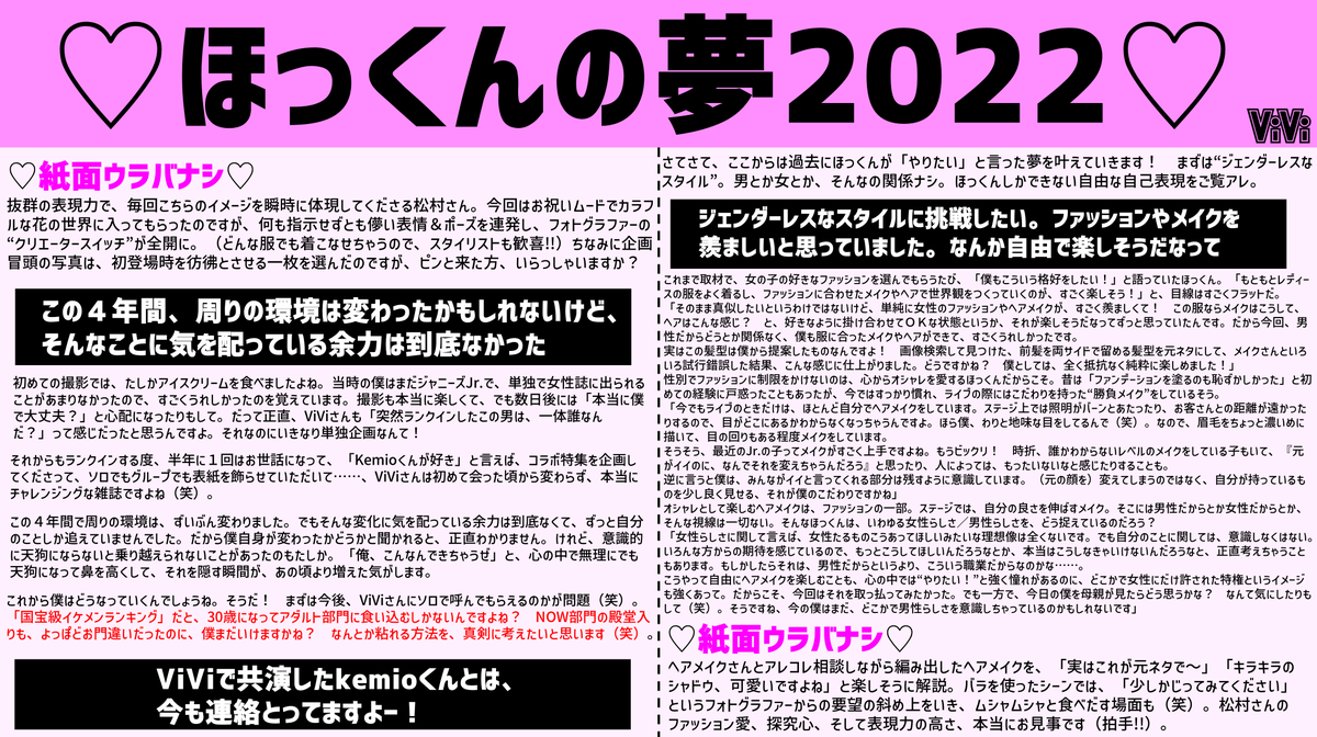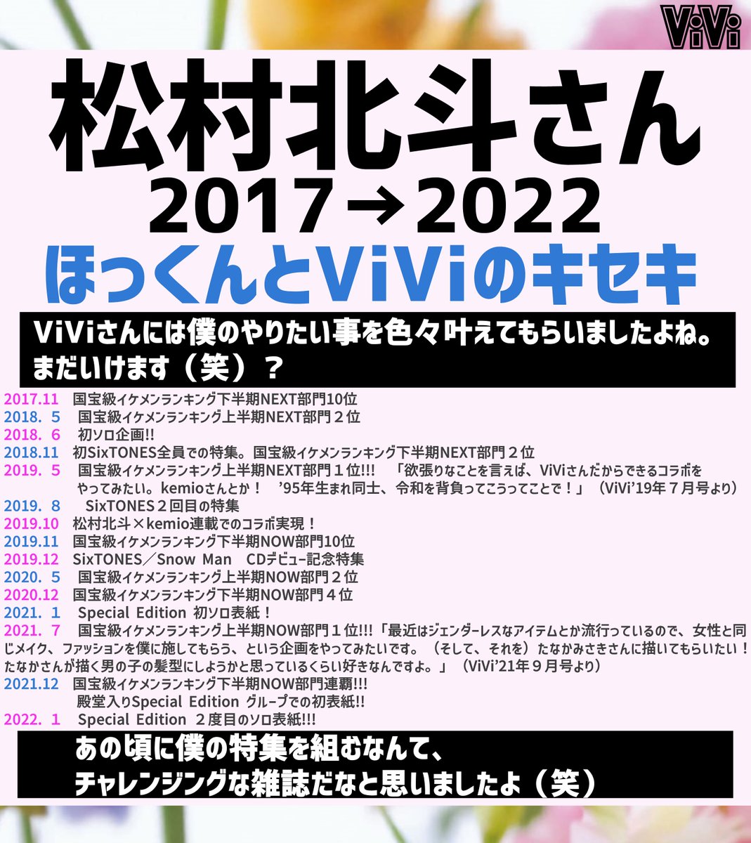 【#松村北斗】国宝級イケメンの殿堂入りを果たした松村北斗さんとViViのキセキをまとめました♡NEXT部門でランクインしてからいろんなほっくんが見れて本当に最高です...次に狙うはアダルト部門の殿堂入り...!
