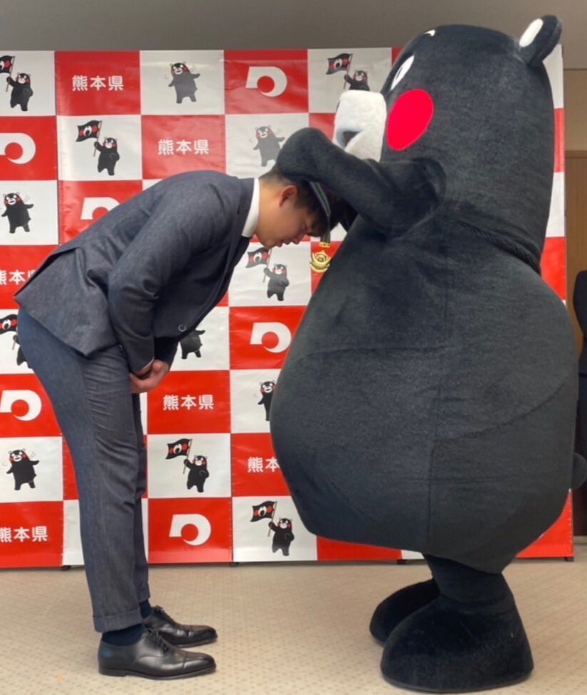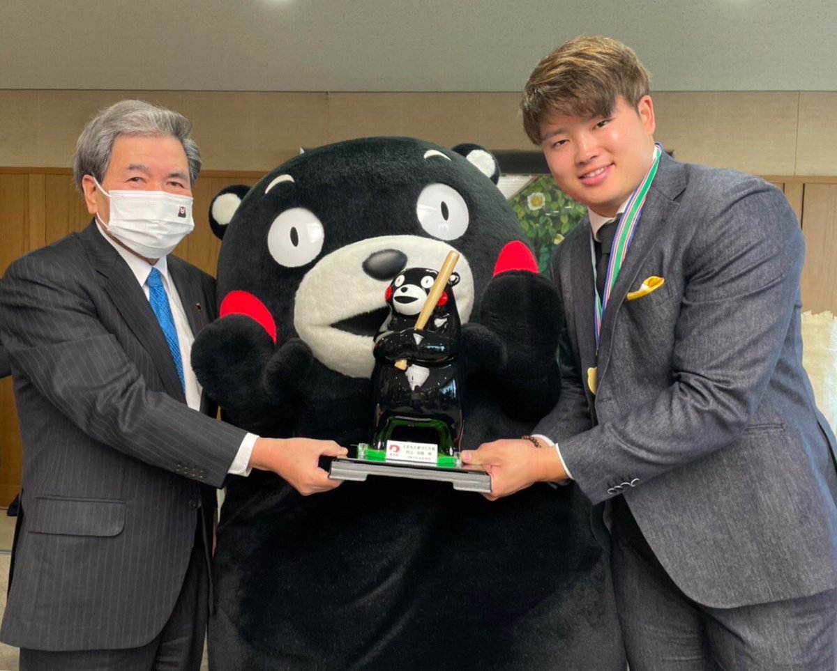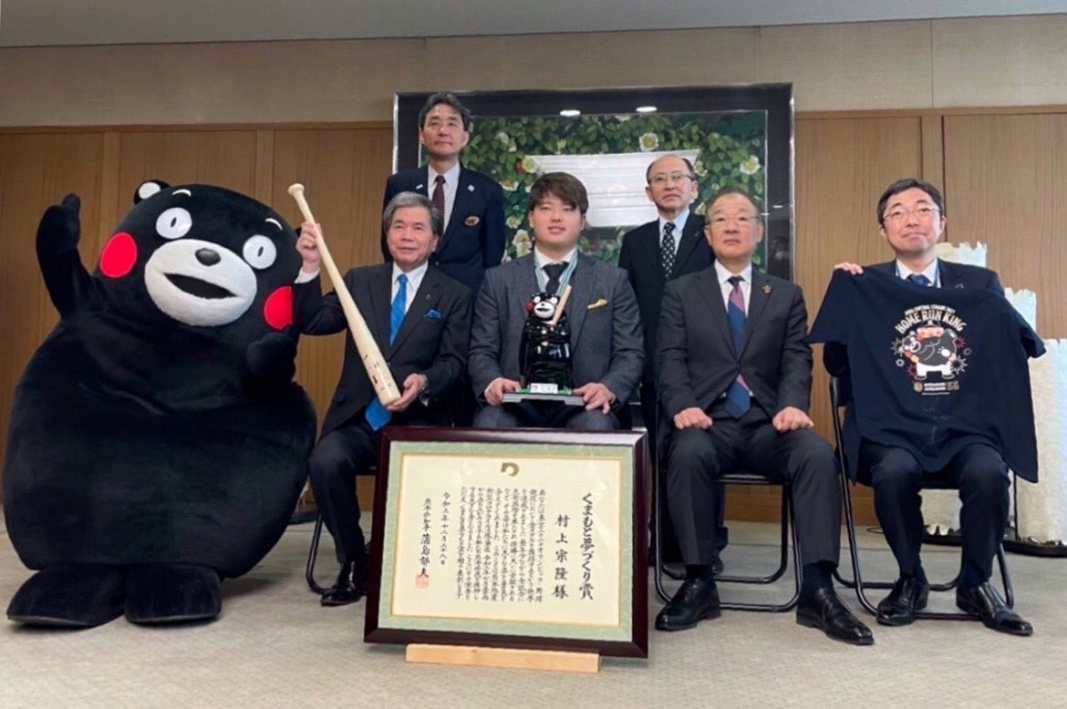 な、なんと!セ・リーグで見事最年少MVPをかくとくされたホームラン王の村上宗隆選手にお会いしてきたモン!知事と一緒にサプライズで、くまモンメダルをおくらせてもろたモン☆たくさんのアツい試合をありがとうございますだモン!ボクもムネさんみたいにむしゃんよかおとこになりたかモン・・・☆