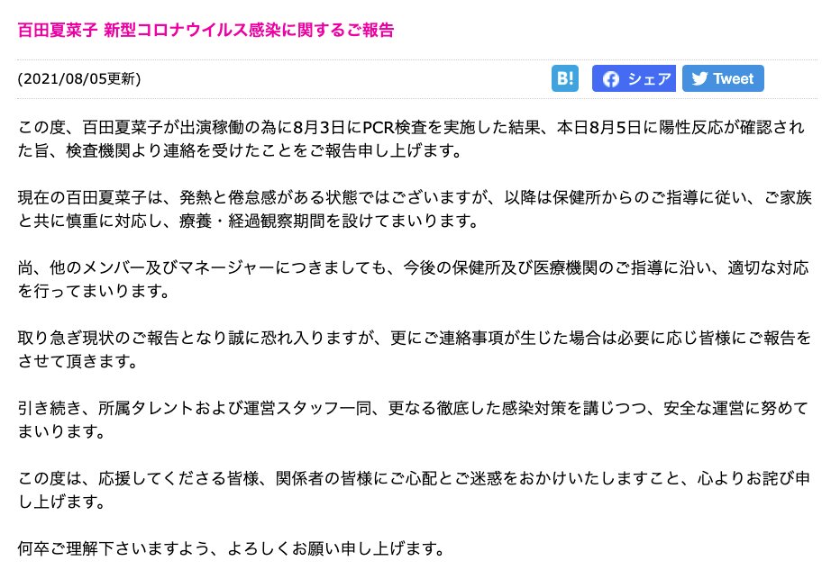 百田夏菜子 新型コロナウイルス感染に関するご報告