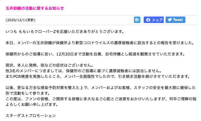 本日、メンバーの玉井詩織が保健所より新型コロナウイルスの濃厚接触者に該当するとの報告を受けました。