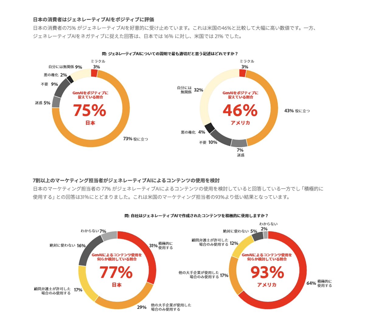 特に後半の日本の消費者が生成AIに好印象を抱いている一方で、マーケティング担当者の積極性はアメリカが圧倒的でこの逆転は示唆的すな