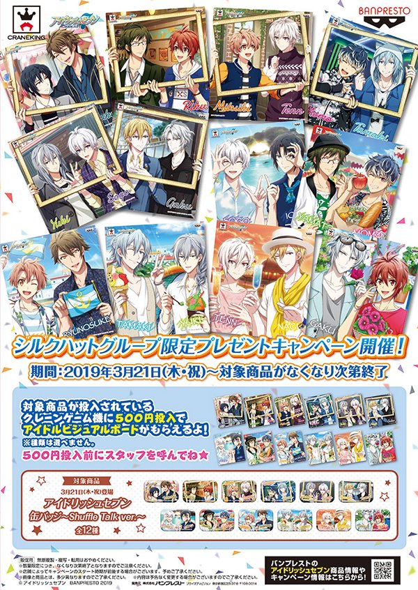 【プライズ】 3/21(木) シルクハットグループのお店限定でShuffle Talkシリーズの缶バッジが登場します!さらにマストバイキャンペーンに参加するとビジュアルボードをプレゼント!詳しくはこちら→bpnavi.jp/s/toru/pc/priz… #アイナナ