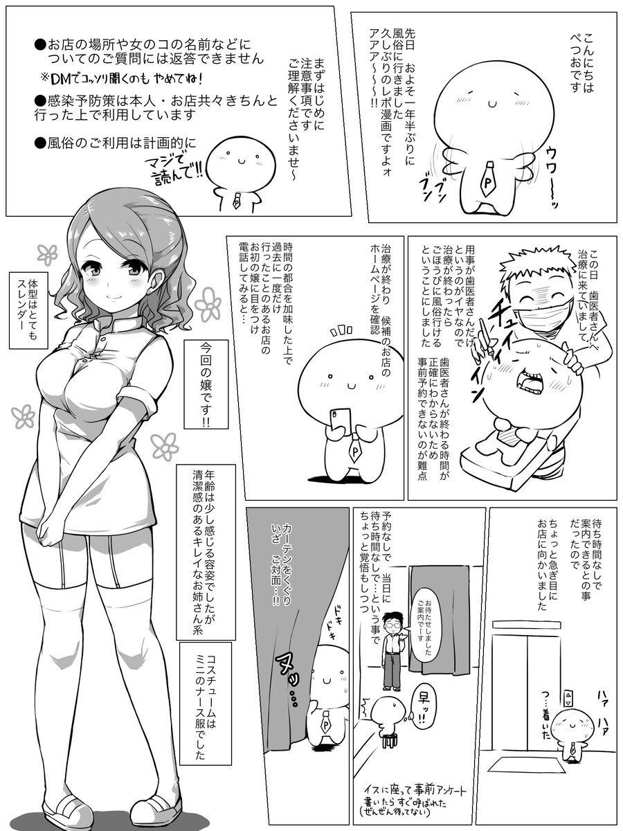 skebしかやってなくて新規絵がないので、過去のナース風俗のレポ漫画を再掲させてください。。(((( ゚∪゚))))