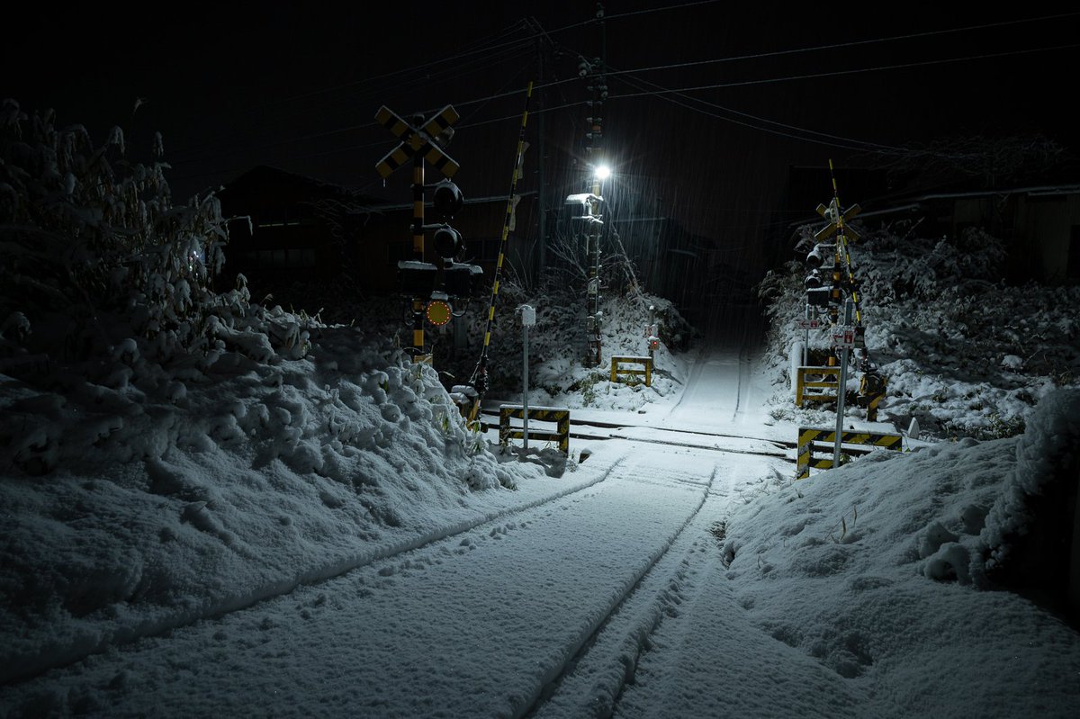 何もない空間に浮かぶ踏切が タイヤ痕で現実と繋がる。