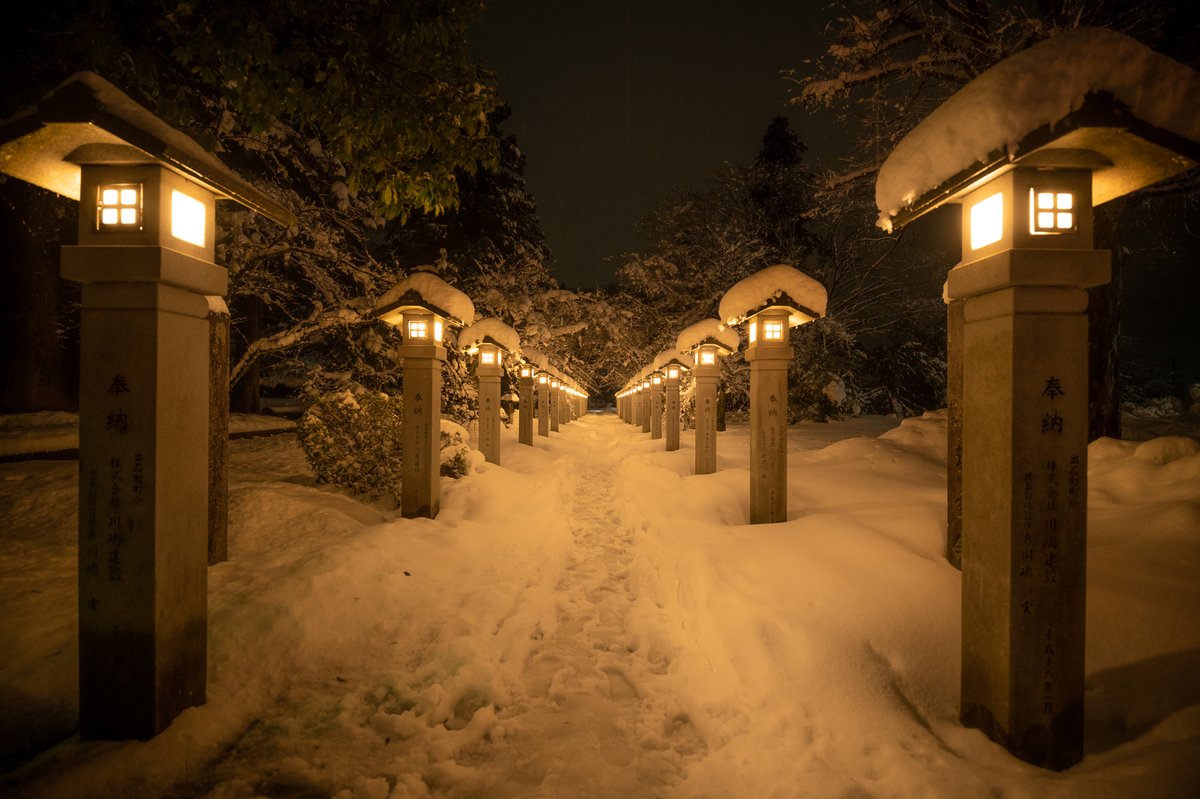 直線で構成された灯篭が 雪の中 超古代文明の遺産っぽく灯る神社で 年を越した。