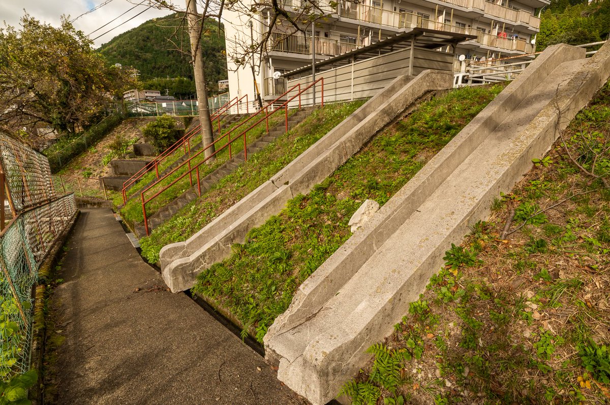 団地に住むサラリーマンたちも つらい朝 この滑り台で勢いをつけて出社するのだろう。