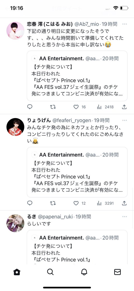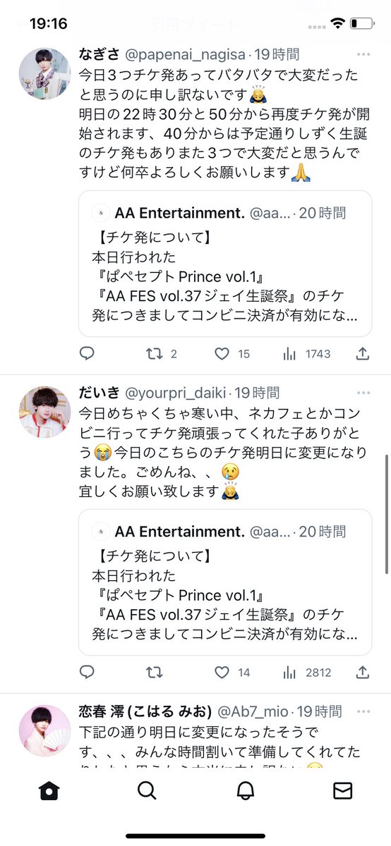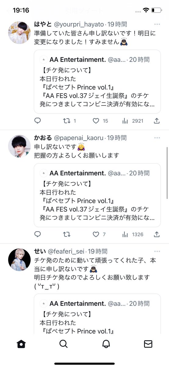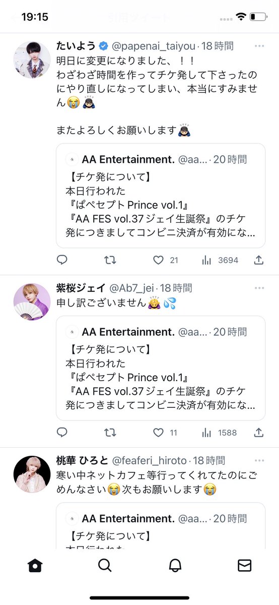 メンズ地下アイドルの先着チケット発売における良番争奪戦は年々激化しており、最近はみんなネットカフェに行きゲーミングPCを使うなど文字通り命がけになっているため、運営のミスで発売がやり直しになると演者が総出で謝る光景が見られます。 twitter.com/aa_official091…
