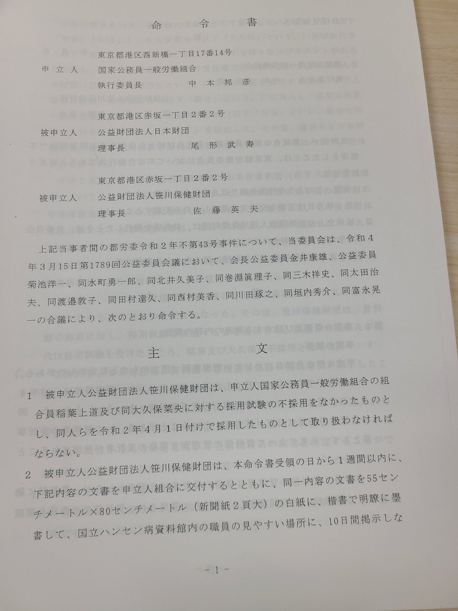 聞くところによれば、笹川保健財団は、命令を受けた組合の団交申入書の受け取りすら拒否しているようです。このような団交申入れの拒絶は労働組合法7条2号違反の違法行為です。笹川保健財団は違法行為を繰り返すことなく、組合の要求に真摯に対応すべきです。 twitter.com/TokyoMinpo/sta…