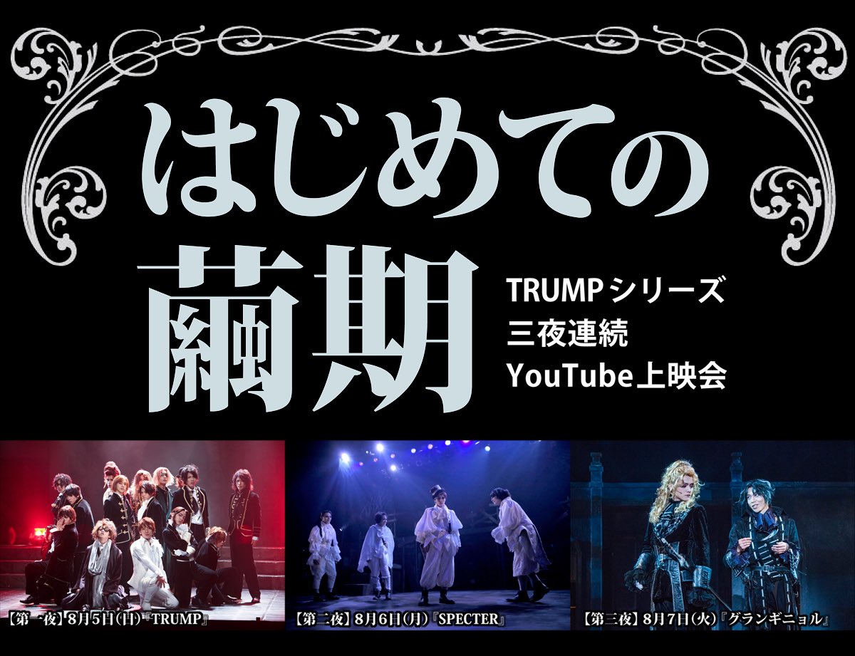 【3時間後!】本日よりTRUMPシリーズ三夜連続YouTube上映会「はじめての繭期」が開催されます。第一夜はDステ版『TRUMP』。20時から下記のURLにてどなたでもご覧いただけます。よろしくお願いします!