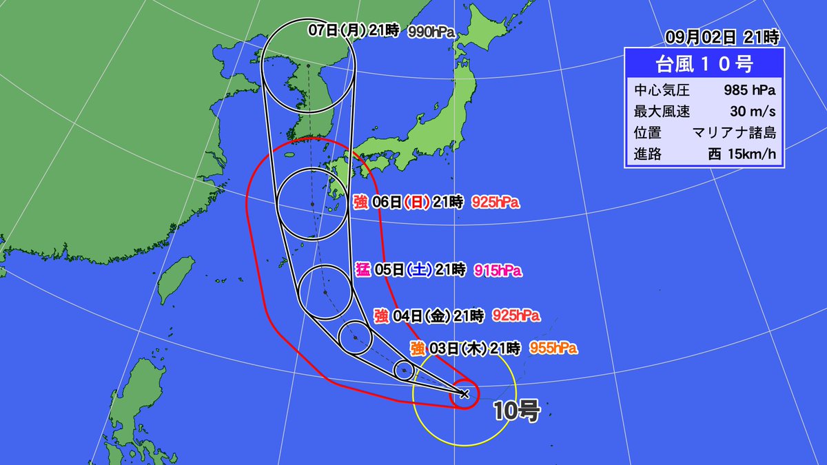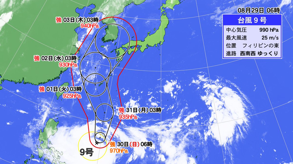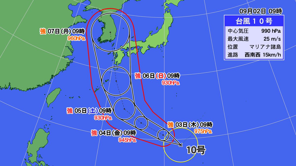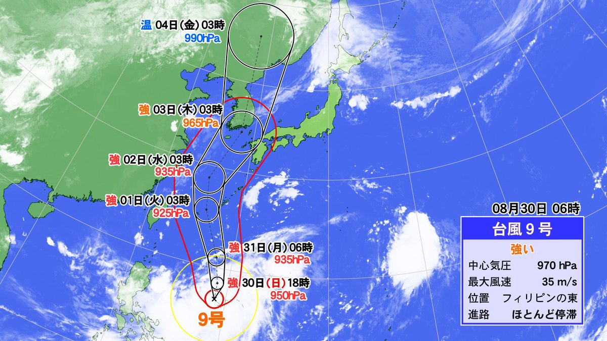 思いのほか速くシェアされているので補足しますが、まだ↑の予測は勢力も進路もブレが大きいです。明日になったら全然違う予測に変わっているかもしれません。