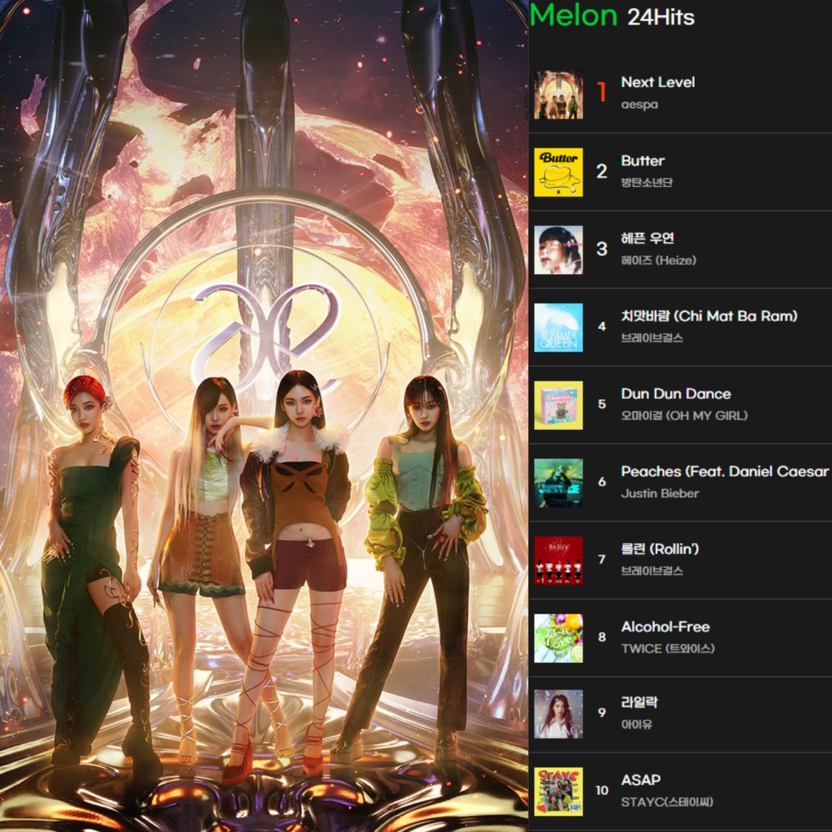 .@aespa_official "Next Level" becomes the 1st SM song to peak at #1 on MelOn 24Hits Chart