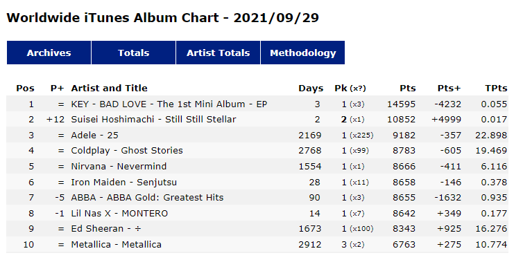 .@SHINee Key's "Bad Love" ranks #1 on Worldwide iTunes album chart for 3 consecutive days