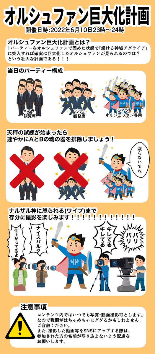 オルシュファン巨大化計画ですが、オルシュファン専用PTの皆様と日程調整が終わりましたので、今週末の金曜23:00~実施します!プライベートで募集立てる予定です!PW等は当日また告知します! twitter.com/sumi_no_sumire…
