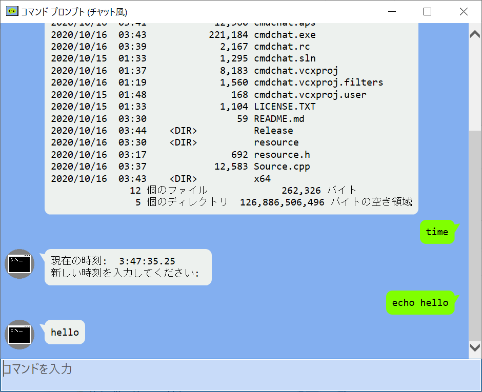 「コマンドプロンプトは黒い画面に文字がたくさん出て怖い」という人がいるみたいなので、チャット風コマンドプロンプトを作ってみた。以下でソースとバイナリ公開しています。