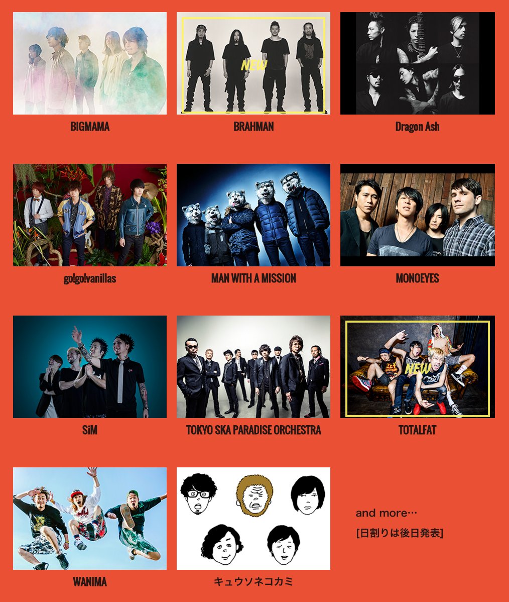 追加出演者&日割りを発表します!140文字では書ききれないので、詳しくは公式HPを見てください!27日ブラフ・ドラゴン・キートーク・シム・スカパラ・TF/28日ママ・バニラズ・インディゴ・マンウィズ・モノアイズ・ワニマ・キョネンオトダマオオトリ・ゲス極・アラスカちゃんです!!