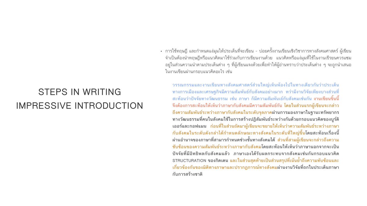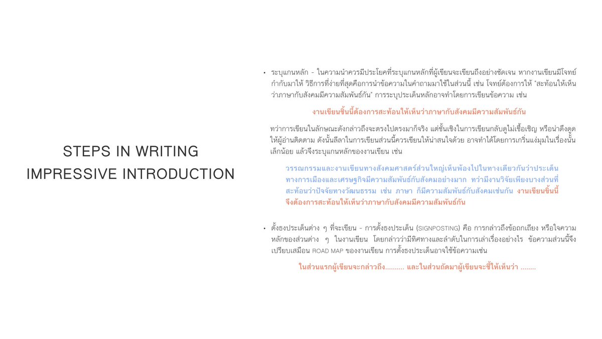 สอนตั้งแต่กระบวนการคิด เทคนิคจำเป็นพวกการสแกนและคัดเลือกบทความ ดีไซน์บันทึกข้อค้นพบ การใช้ข้อมูลที่ได้ การเขียนส่วนต่างๆ เช่น ความนำแบบต่างๆ กลเม็ดเขียนบอดี้