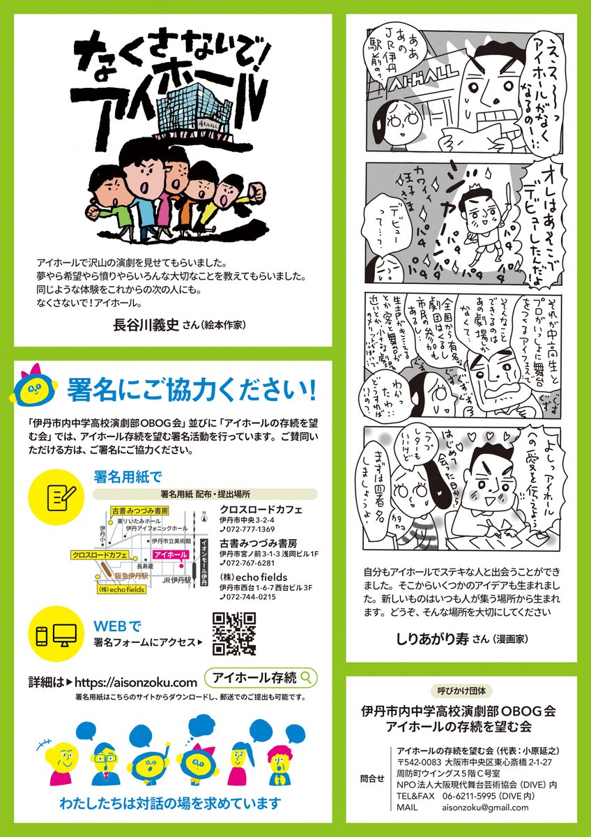 伊丹市民の方と一緒に、今回のアイホール廃館!?の経緯や「そもそもアイホールってどんな場所?」などまとめたチラシを作りました。伊丹の方々と何度もメッセンジャーでやりとりして、みなさんが知りたいことをできる限りわかりやすく簡潔に。明日から伊丹市内で配布開始します