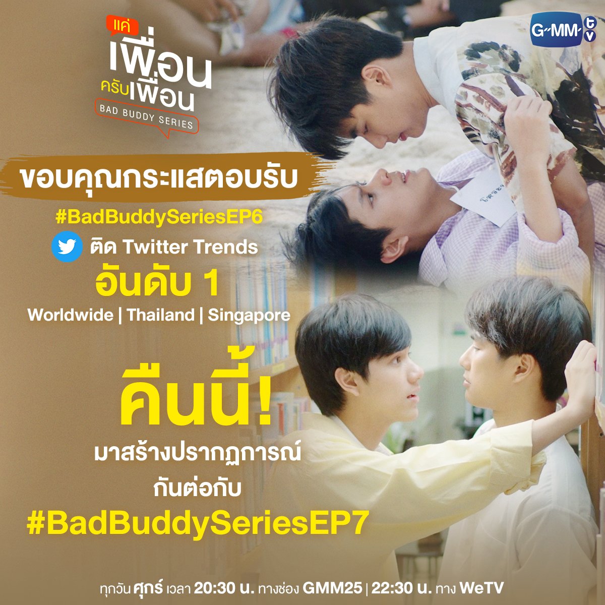 ทุกวันศุกร์ เวลา 20:30 น. ทางช่อง GMM25 | 22:30 น. ทาง WeTV