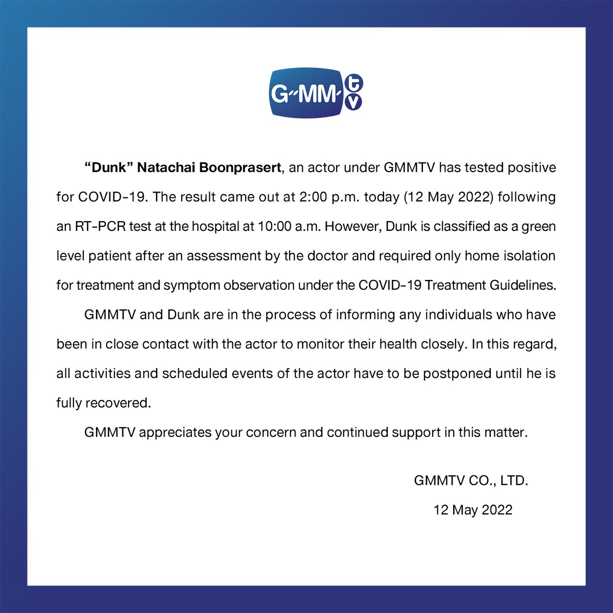 “GMMTV” ขอแจ้งให้ทราบว่า “ดัง-ณัฎฐ์ฐชัย บุญประเสริฐ” นักแสดงในสังกัด GMMTV พบเชื้อ COVID-19