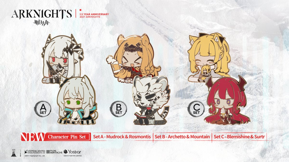 日本版の1周年記念グッズに続いて、アークナイツEN版1.5周年記念グッズのピンバッジ6種のイラスト担当してますので、よろしくお願いします!