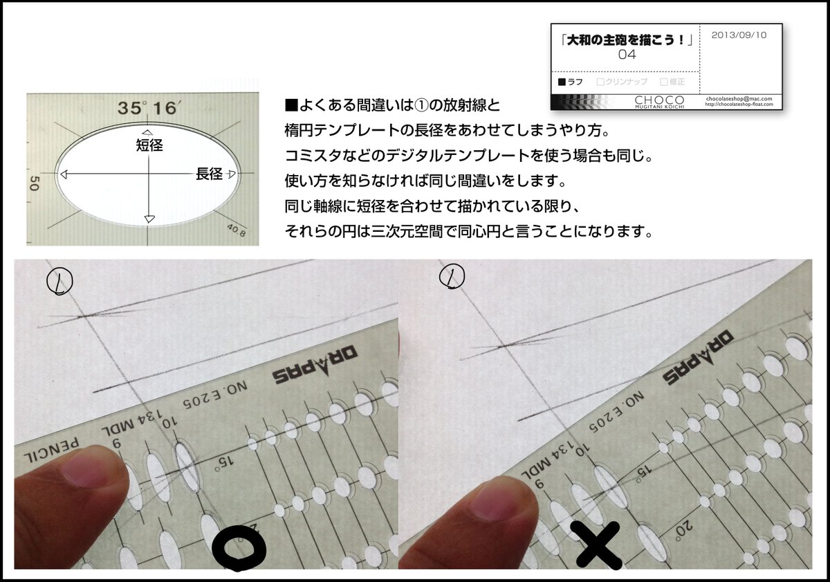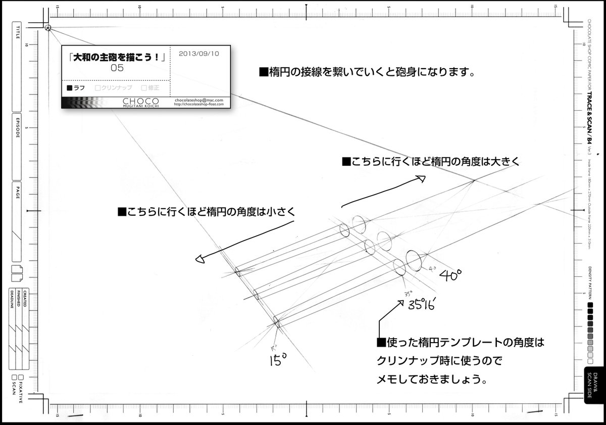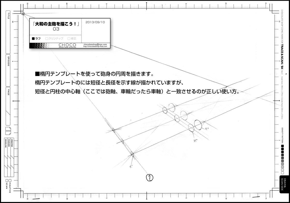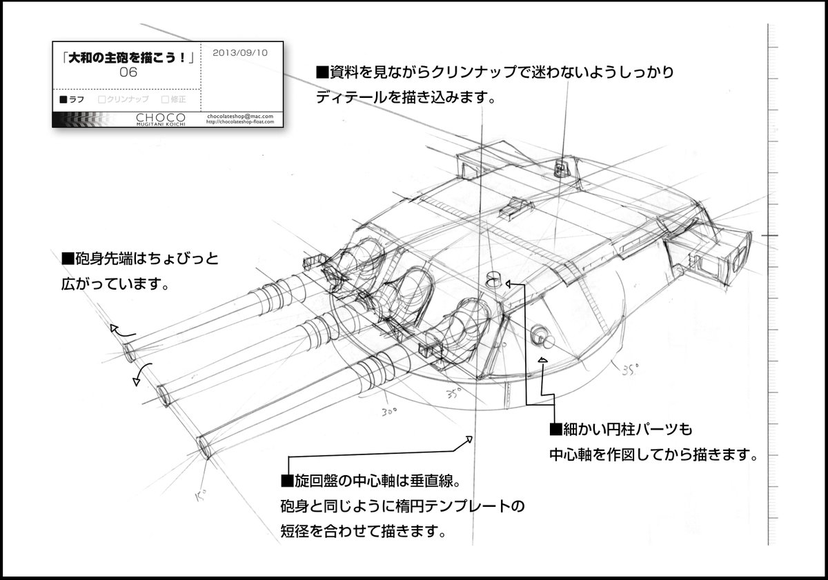 >戦艦の資料も手に入ったので、以前美和先生に描けっていわれた楕円テンプレートを使った主砲の描き方真面目にかいてみた。