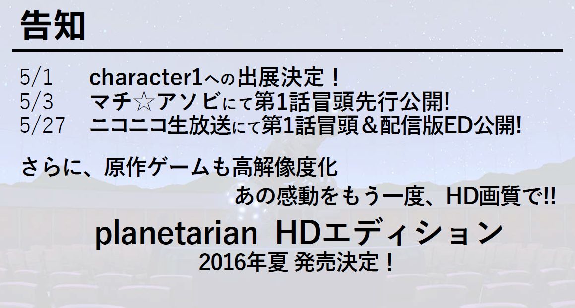 公式HPにカウントダウンがございますがこちらなんと4月15日(金)に「planetarian project」製作発表会の開催が決定!当日開場でのご参加も可能ですので公式HPをご覧ください!