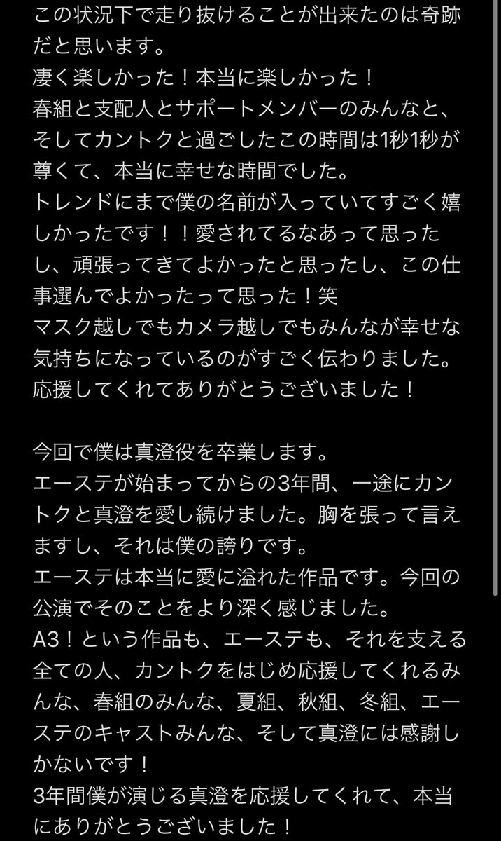 僕はこの公演をもって碓氷真澄役を卒業します。コメントが載ってます!読んで頂けると幸いです。