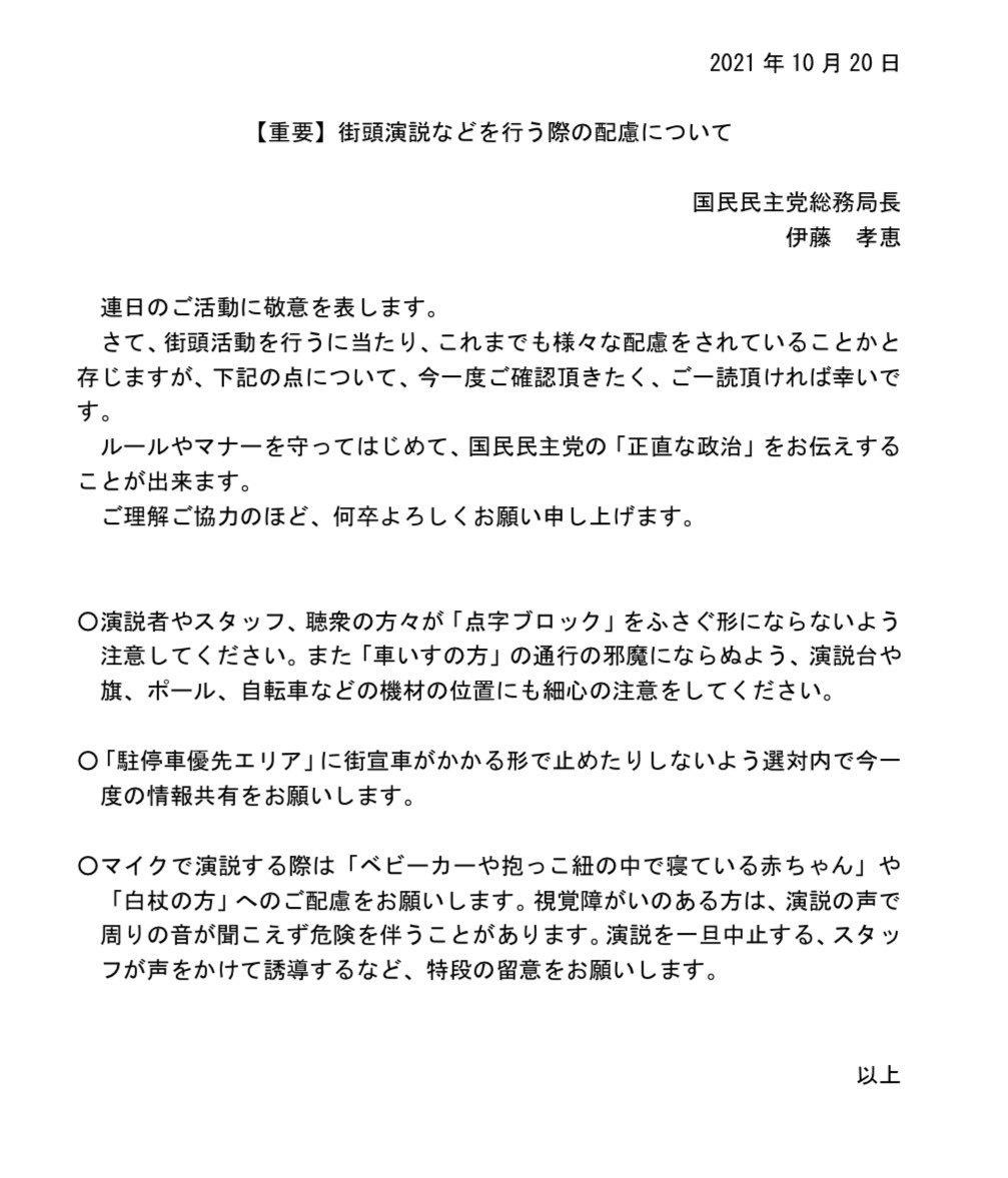 国民民主党候補者、選対に本日付で発出しました。しかしながら今後も、我々に配慮が足らなかったり、想像が至らなかったりする場面もあるかと思いますので、引き続きご指導賜れれば、お気付きの点がありましたらご連絡頂ければ、幸いです。宜しくお願い申し上げます。 twitter.com/itotakae0630/s…