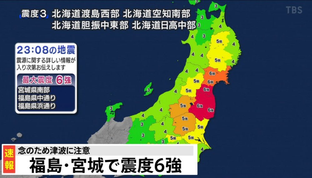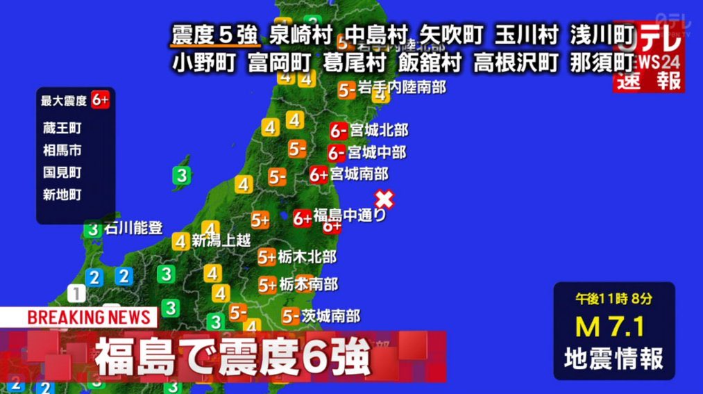 TBS「福島で震度6強」 日テレ「福島で震度6強」 フジテレビ「福島で震度6強」 テレ東「マッケンチーズって知ってる?」