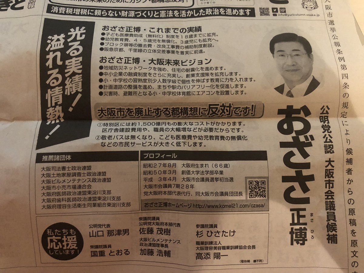 @okazakifutoshi 公明党市議団の団長が、都構想で敬老パスが無くなると選挙公報に記載…これはさすがにいただけないですね