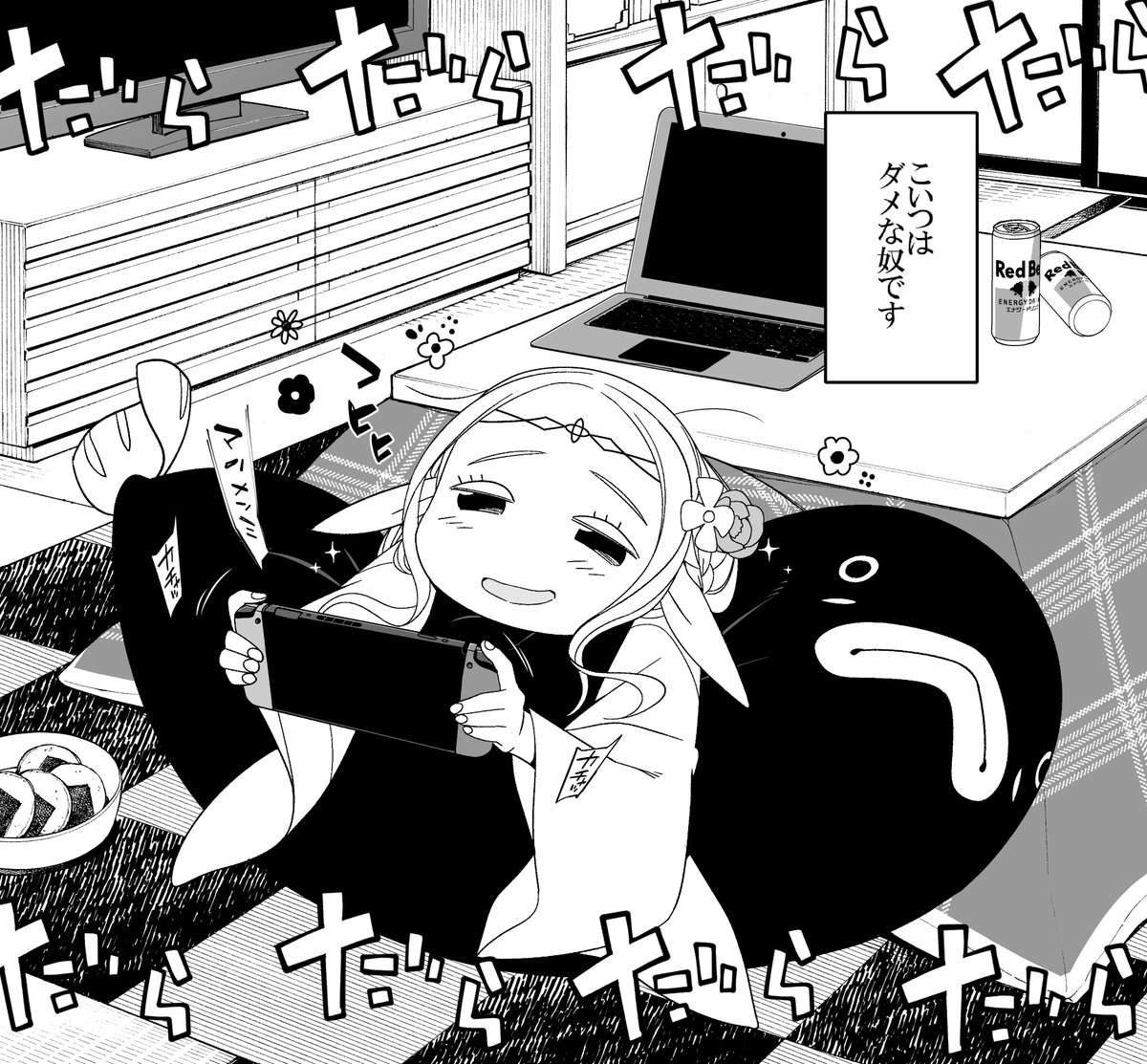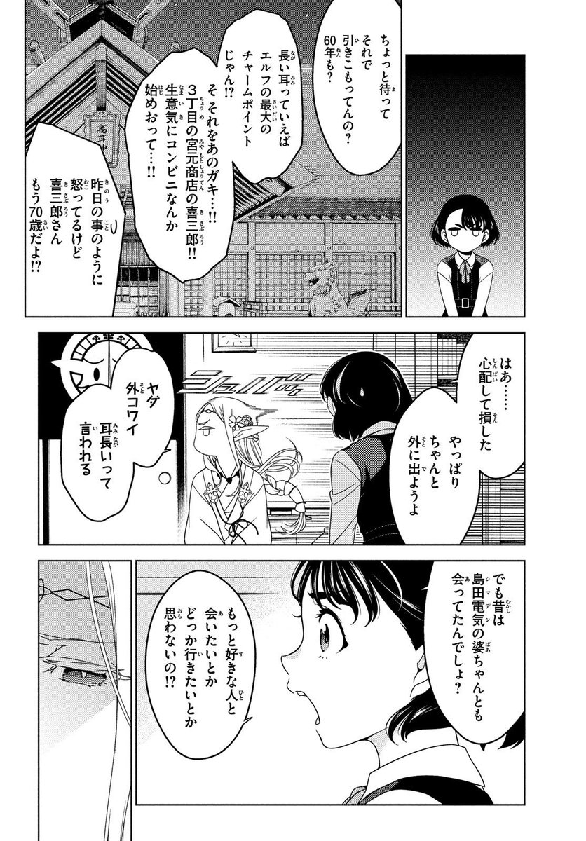 あとですね….アニメから見始めて下さった方には言いづらんですがこのエルフはホントに外出ません…初期案では東京の名所名跡を巡る漫画にする予定だったんですがホントに出ないんです…エルフが外に…