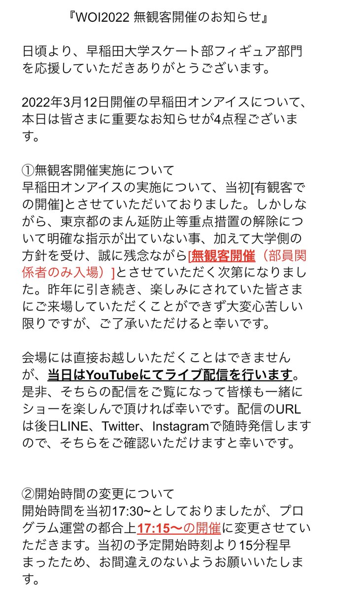 明日のWASEDA ON ICE2023は有観客開催ですが、会場に来られない多くの方にもご覧いただくために、YouTubeにて配信も行います!✨️