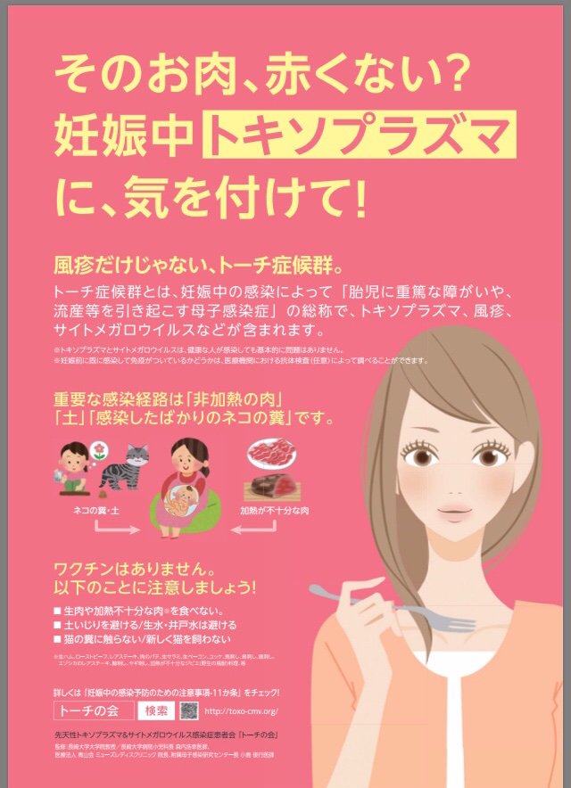 妊娠中に初めてトキソプラズマに感染することで、胎児に感染して流産の原因になったり、脳や眼の病気、肝臓の腫れなどを起こす可能性があります。生肉や加熱不十分な肉は食べないことや、土いじりを避けることなどが感染予防となります。詳しくはトーチの会のサイトで→toxo-cmv.org/toxo/toxo-q8/