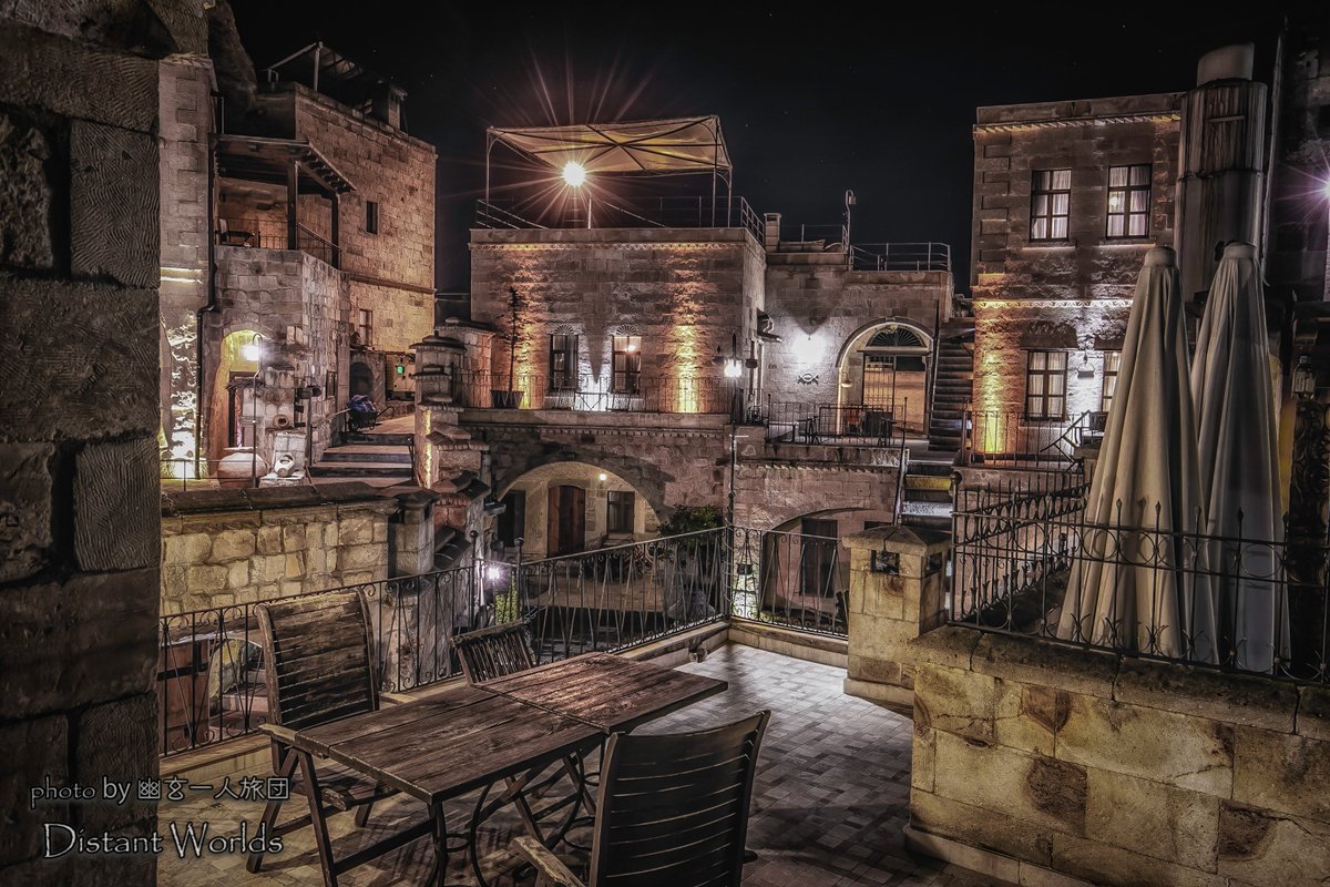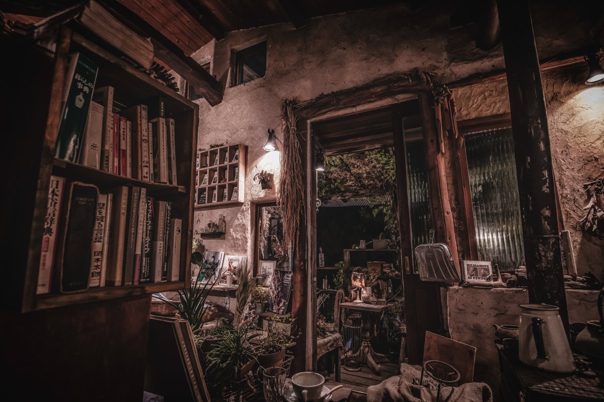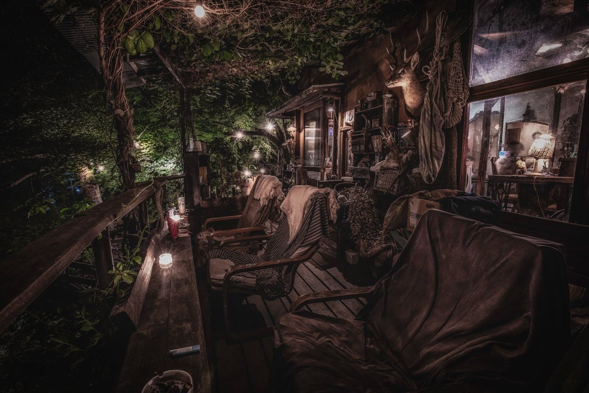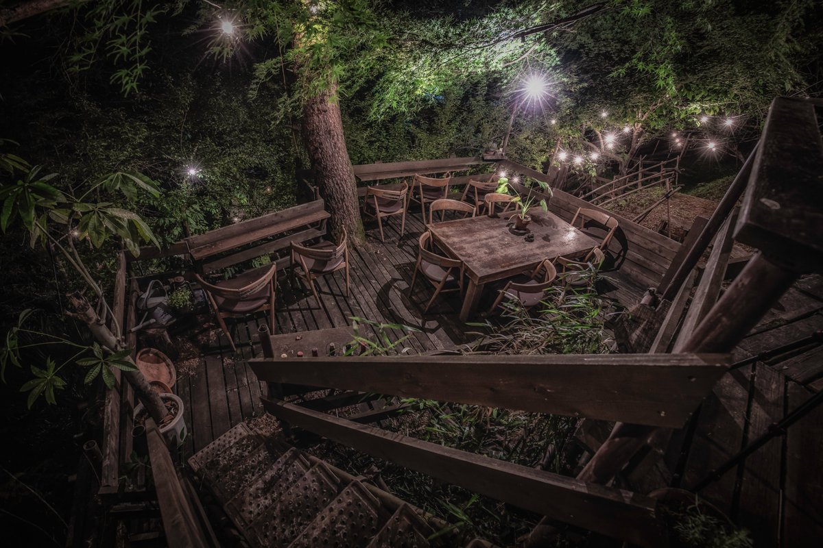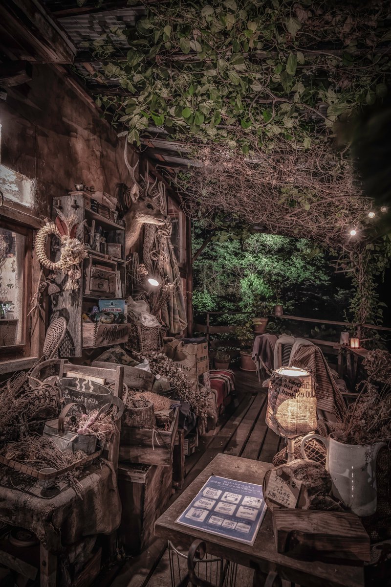灯りに照らされたテラスを歩くと何処かへ迷い込んだのかと錯覚する。新月と満月の日だけ昼も営業している…というのも何だか心くすぐられるものがある(山梨-カフェ・ナチュラリズム #Distantworlds_sb