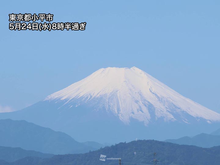 昨日、各地で降った雨は高い山で雪となり、富士山は中腹まで雪化粧をしました。雲ひとつない晴天となった今朝は東京都内からも富士山がくっきりと見えています。