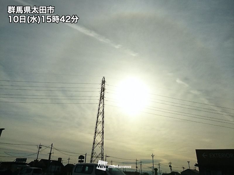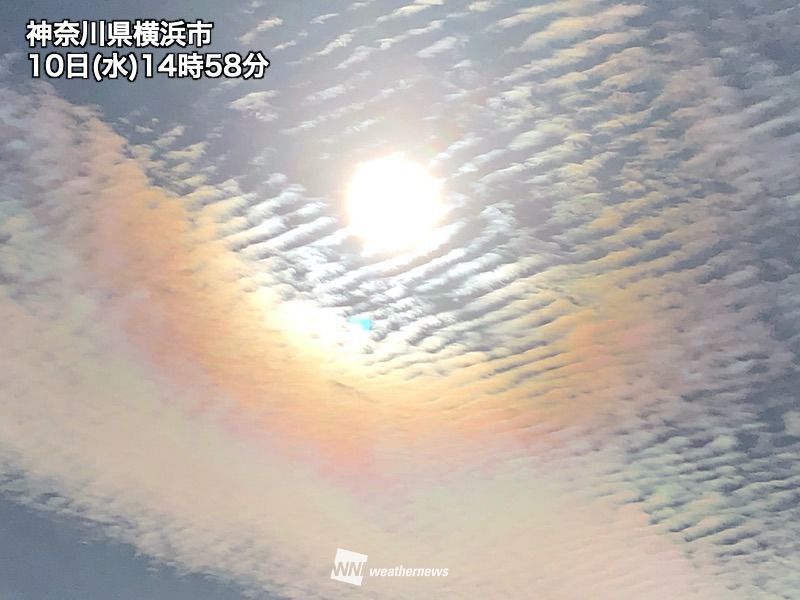 今日の関東は高気圧に覆われて晴れたものの、上空の高い所には雲が広がっています。その影響で、彩雲やハロ、飛行機雲、波状雲など様々な現象が見られています。