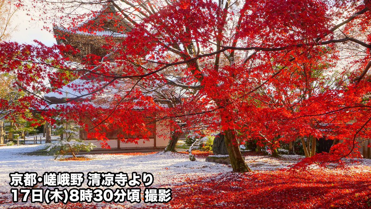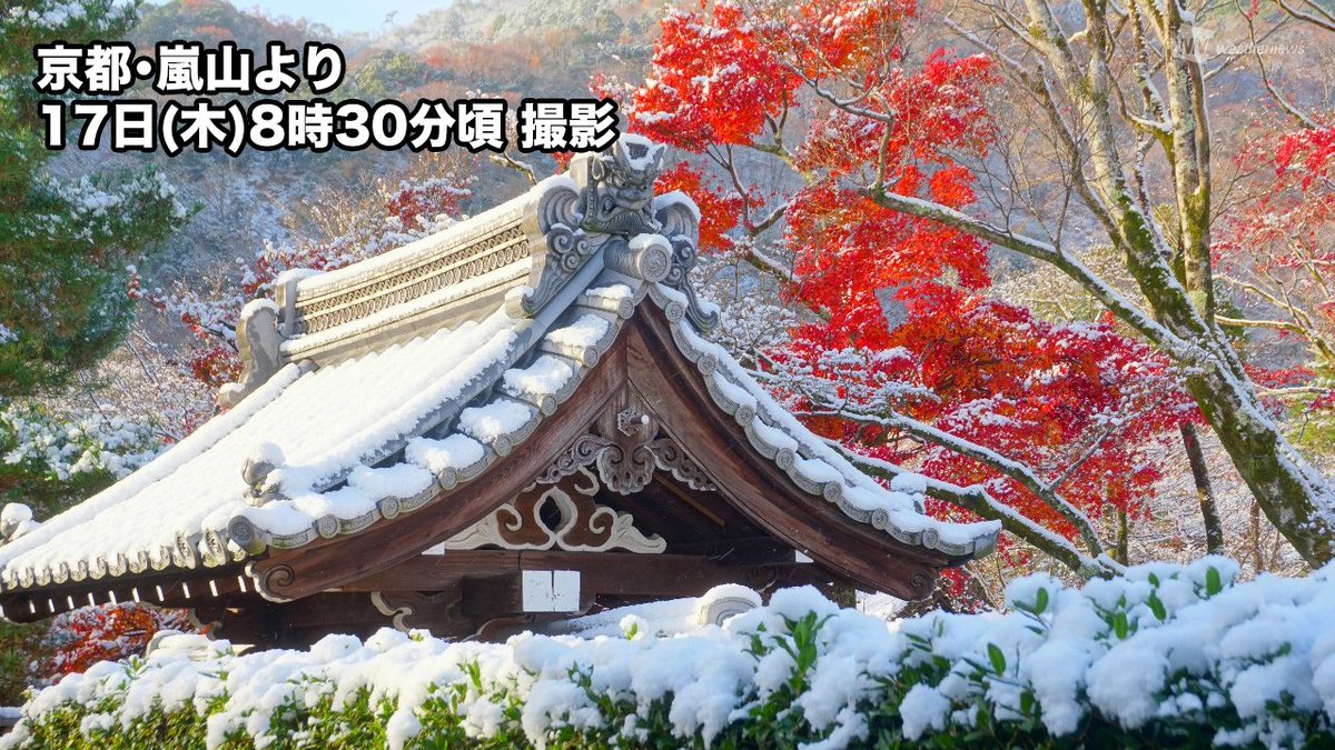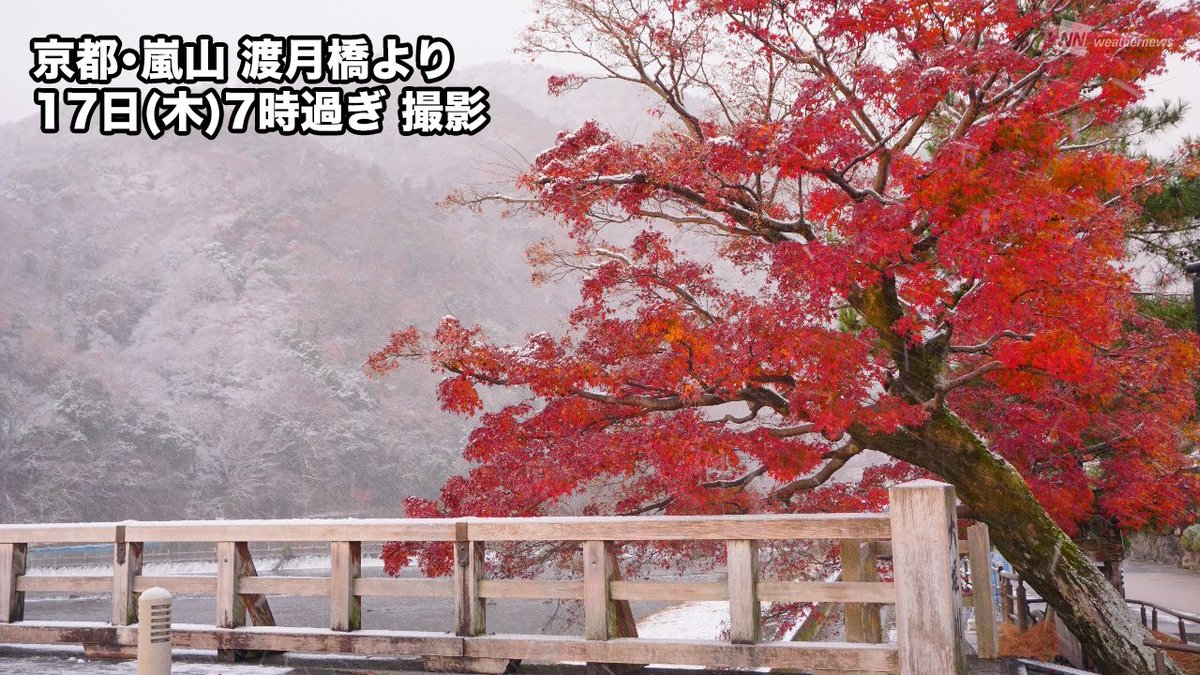 嵐山周辺の名所では紅葉のピークは過ぎましたが、名残りの真っ赤な紅葉と白い雪のコントラストが、趣のある初冬の風景にアクセントを添えています。