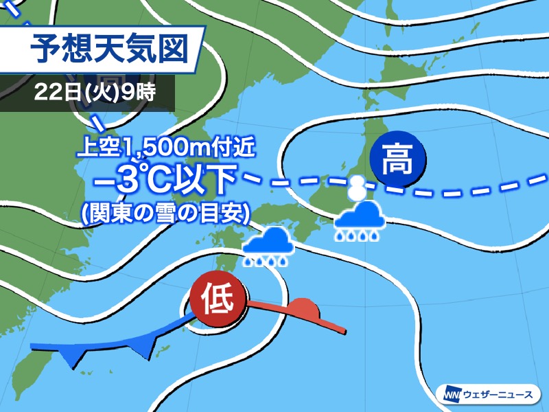 連休明けの22日(火)は低気圧や前線が通過して、西日本や東日本の太平洋側を中心に冷たい雨が降る予想です。内陸山沿いでは雪の可能性も。