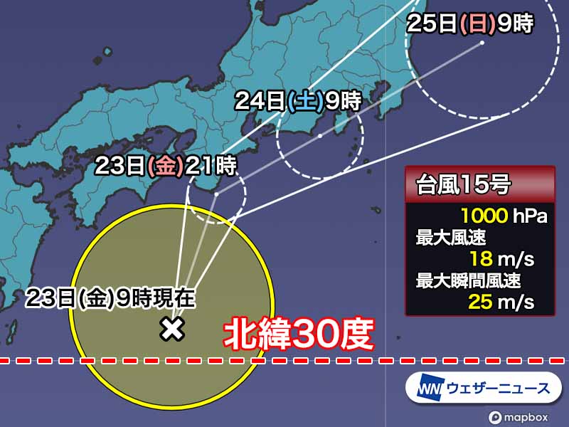 今日23日(金)9時に高知県室戸岬の南の海上で台風15号が発生しました。北緯30度よりも北で台風が発生するのは、2019年の台風3号以来となります。
