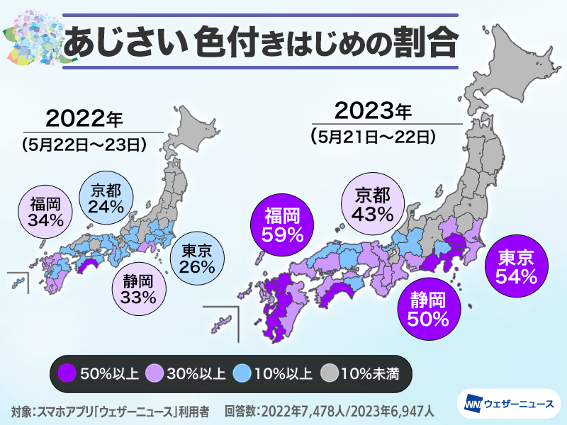 5月下旬に入り、西日本や東日本の各地であじさいが色付き始めています。 関東南部など太平洋側の地域からは、綺麗なあじさいの報告が届いています。今年は梅雨入り前に見頃を迎える所もありそうです。