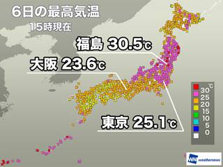 6日(火)の関東や東海は雲が多くなるため、昼間の気温は今日に比べると低い予想になっています。それでも25℃くらいまでは上がる上、湿度が高めで蒸し暑く感じられそうです。