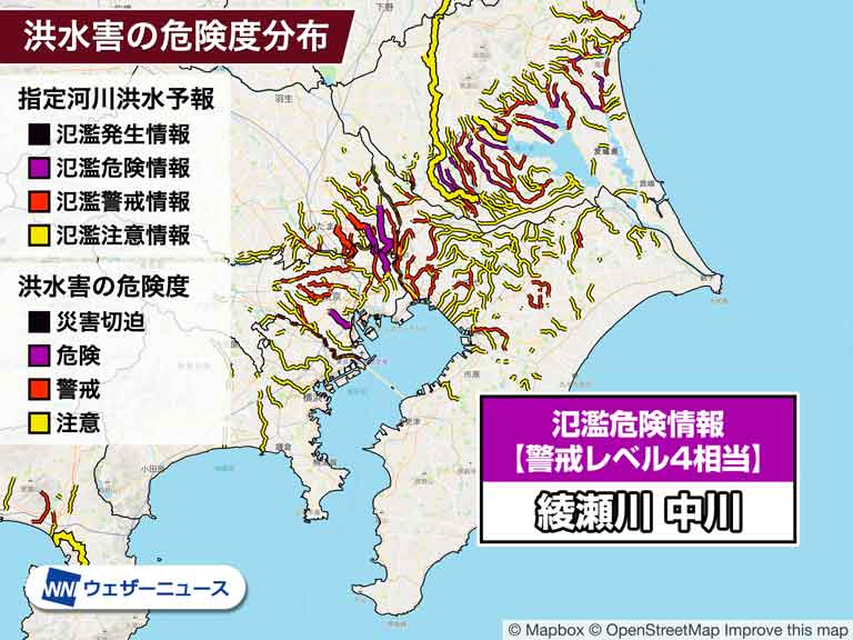石神井川や目黒川に氾濫危険情報が発表されています。