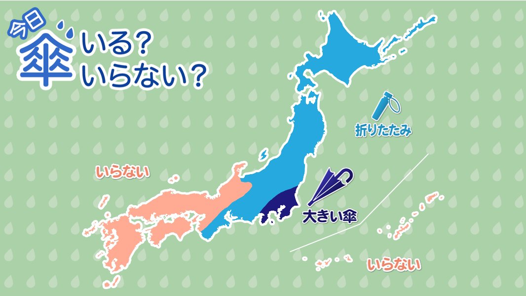 関東は南部を中心に雨が残り、大きい傘が必要です。近畿や中部地方は回復に向かうので、折りたたみ傘でOK!北日本はにわか雨に備えて鞄に傘のご用意を。